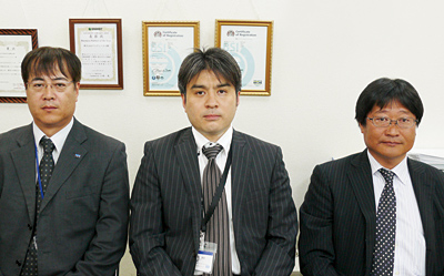 アイディーエスの菅原達哉社長(写真中央)は、「ITCのノウハウなど当社の持ち味を生かして他社との差異化を図っている」とアピールする。(写真左はITC資格をもつ福田清男・ビジネスシステム本部長、写真右は自社ソフトの販売を担当する菊池清信・システム営業本部長)