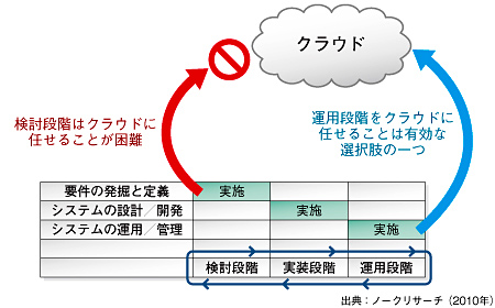 クラウドとは「情報処理システムを稼働させるための環境を提供するもの」といえる。だが実際には、稼働環境を考える前にすべきことがたくさんある。自社の業務を踏まえたうえで、どんなシステムにすべきかを考える「検討段階」と、システムの設計と開発作業を行う「実装段階」を経て、ようやく稼働環境を整えて「運用段階」に入る。業務内容が変化すれば再び検討を行い、システムは企業とともに成長していく。情報処理システムには、こうしたプロセスを繰り返す「ライフサイクル」が存在する。