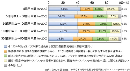 この結果を見ると、サービス提供者とユーザ企業が個別に直接契約する場合と、既存の販社/SIerを含む何らかの業者が間に入る場合とは、おおむね4対6。ユーザー企業が何らかの仲介役を望んでいるのか、いないのかは、半々に近い状態ということだ。