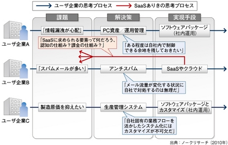 SaaSはあくまで情報処理システムを構築・運用するための手段の一つにすぎない。ユーザー企業が求めているのは、個々の業務を支援するソリューションであり、その実現手段が社内運用とSaaSのいずれであるかは、ユーザー企業の現状やソリューションが目指す目的/効果によって大きく異なってくる。