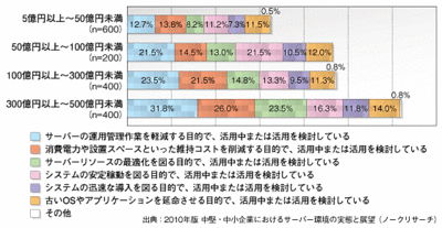 年商100億円以上のユーザー企業では、「サーバー運用管理作業の軽減」「消費電力や設置スペースなどの維持コストの削減」「サーバーリソースの最適化」といったようにサーバー統合に関連する項目が多く挙げられている。中堅企業の中でも比較的年商の高い層では、大企業と類似した傾向を示しているといえる。