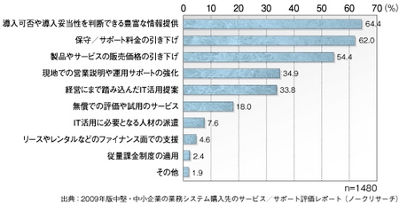 種々の経済指標では、景気は少しずつ回復しているという見方もある。だが、中堅・中小企業(SMB)にとっては依然厳しい環境であることに変わりはなく、IT投資についても更新需要主体の弱含みな回復といった状況だ。こうしたなか、ITを提案する側としては、ただ単に価格を引き下げればいいというわけにもいかない。以下のグラフは年商5億円以上500億円未満のSMBに対して、「業務システムの購入先に望む事柄」をたずねた結果である。