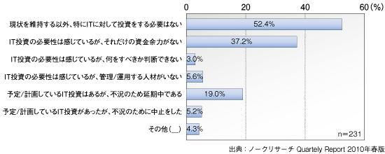 では、景気が回復した場合、SMBのIT投資はどれくらい改善するのだろうか。図1は、10年5月に年商500億円未満の中堅・中小企業に対して「IT投資額を減らす理由」をたずねた結果である。