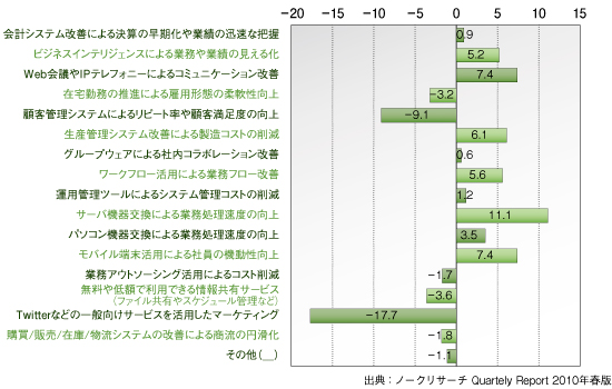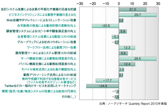 逆に経常利益増減を軸としたグラフでプラスであり、IT投資増減を軸としたグラフでマイナスとなっている項目は、「by ITの投資」として認識されやすい。図では、「生産管理システム改善による製造コストの削減」がそれに該当する。厳しい経済環境でありながら、中堅・中小の製造業が生産管理システムへの投資に意欲的である現状は、自社の生き残りをかけた「by ITの投資」の重要性を物語っている。