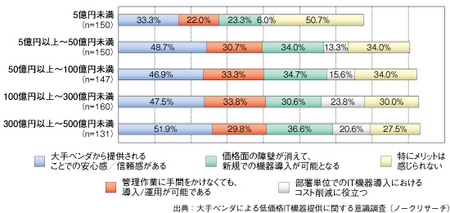 これとは対照的に、年商5億円以上のSMBは、約50%が「大手ベンダーから提供されることでの安心感・信頼感がある」ことをメリットに挙げている。価格面や運用管理面のメリットも約30%が支持し、「部署単位でのIT機器導入におけるコスト削減に役立つ」という回答は、年商規模が上がるにつれて増える傾向にある。