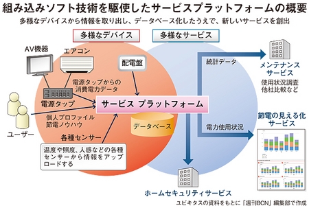 組み込みソフト開発に強いユビキタスは、向こう10年の経営ビジョンのなかで、電力消費や使用状況などをデータベース(DB)化し、新サービスの開発につなげる“サービスプラットフォーム”構想を打ち上げた。すべての機器をインターネットにつなげる「Internet of Things(IoT)」の考え方に基づくもので、Wi-Fi(無線LAN)やZigBeeなどの無線通信を駆使して、家電やセンサー類をインターネットにつなげて、ネット上のDBで動作状況を分析。電力消費の見える化を実現するとともに、機器の保守運用、ホームセキュリティなどのサービスとリンクさせる。ユビキタスは、こうしたサービスプラットフォームを中心とするネットワークサービス事業の売り上げを「今後3年間で倍増近くまで伸ばす」(三原寛司社長)と意欲を示す。 大手SIerのTISは、Javaベースのサービスプラットフォームである「OSGi(Open Services Gateway initiative)」を駆使するアプローチで、家電やAV、PC、センサー類などの情報を集約化し、新サービスの創出に取り組む。最初は個々の家庭や事業所からスタートし、将来は、「地域や工業団地単位で省エネや、新サービスをつくり出すスマートインフラの役割を担っていく」(林靖彦・OSGi部グループマネジャー)ことを視野に入れる。