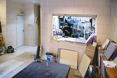 原田左官工業所は、「左官屋さん」のイメージを打ち破ろうとしている。タイル工事では、国内メーカーのタイルのほか、輸入タイル、オーダーメイドタイルなどを扱う。モザイクタイル、大理石の施工にも対応する。防水工事は、火を使わず臭いも少ない湿式防水に特化している。組積工事では、外部のブロック積みや化粧ブロック、内装防水用のブロック積みに加え、ピザ釜などの耐火レンガ積み、デザイン壁の特殊ブロック積みなどのニーズに応える。左官工事にとどまらず、幅広い業務に対応することを強みとしている。