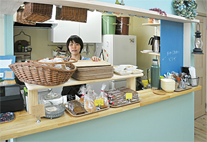 木などの自然素材を使い、明るい空間の「mama's cafe joy」は、毎日午前11時半からカフェタイムがスタート。ランチやケーキ、離乳食セットなど、母子に適したメニューを用意する。カフェタイム前の時間には、「mama's cafe joy」を運営するmama life support joyの山田綾子代表が、スポーツクラブのインストラクターだった経験を生かして、ベビーマッサージや骨盤矯正ピラティスを中心とする健康レッスンを行っている。