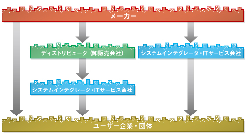IT業界で、メーカーが製品・サービスをユーザー企業・団体に販売する方法は、主に二通りある。一つは、自社の営業担当者が直接ユーザーに販売する「直販」。もう一つが、システムインテグレータ(SIer)や卸販売会社(ディストリビュータ)を通じて間接的にユーザーに届ける「間接販売」だ。多くのユーザーにアプローチするには、間接販売が有効なので、複数のメーカーは間接販売するITベンダーを販売会社(販社)として組織する。販社は、広告業界でいう広告代理店のようなもの。複数メーカーの製品を取り扱い、ユーザーの要望に合わせて最適な製品を選んで、もしくは組み合わせて販売する。