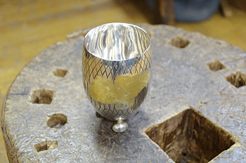日伸貴金属(上川一男代表取締役)は、経済産業大臣指定の伝統工芸品である「東京銀器」を手がける認定事業者だ。先代の名である「上川宗照」を継承する上川代表取締役と、息子、娘を含めた5人の家族が銀器職人として働いている。