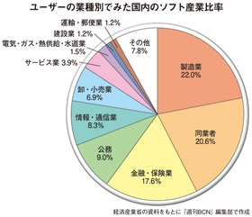 特定サービス産業実態調査(平成22年度版)によれば、約17兆円ある日本のIT産業のうち、ソフト開発は10兆1641億9100万円を占めているが、このうち受託ソフト開発の市場は8兆6289億8700万円。ソフト開発の契約先(顧客)を産業別でみると、製造業がトップの22.0%で、2位は「同業者(ITベンダー)」(20.6%)となっている。同業者に「情報・通信業」を含めたIT産業全体でみると、トップの28.9%となる。日本のIT産業は、ITベンダーからの下請け案件が大部分を占めているのだ。とくに地方では、ユーザー企業の数が少ないことから、同業者間取引額が占める比率はもっと高まる。しかし、こうした下請け体質は、崩壊しつつある。企業・団体のIT環境が一定の水準まで達し、開発案件数は減少。クラウドの登場に伴って、一から開発するシステムも減り、案件の単価も下がった。さらに、元請けのITベンダーは、中国などのオフショア開発を多用し、地方のITビジネス基盤は崩れつつある。受託ソフト開発を主力事業とする企業は、「状況はジリ貧。受託ソフト開発だけでは生き残れない」と口を揃える。