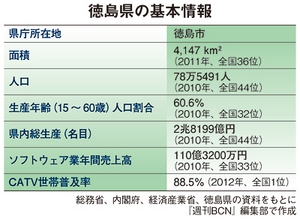 その一方で、県内のブロードバンド環境は、全国屈指のレベルとなっている。県は、地上デジタル放送への移行に伴い、02年~10年にかけてケーブルテレビ網の整備を進めた。その結果、徳島県のCATVの世帯普及率は88.5%と、全国平均の51.6%を大きく上回り、全国1位(12年、総務省)。同時に、自治体が整備した光ファイバー網の芯線長の県民、世帯あたりの距離数も全国1位で、県内ではどんな山奥の地域でも快適なネット環境を利用することができる。
