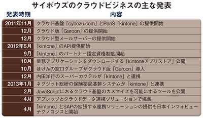 クラウドのユーザー数は着実に増えている。13年5月中旬時点で3000社以上、10万ユーザーを超えた。例えば、大阪のある介護事業者は患者の情報を家族や自治体と共有する仕組みの構築・運用を開始した。青野社長の狙い通り、チームワークのプラットフォームとして使うユーザーが多いという。
