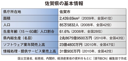 佐賀県の人口は約85万人、面積が約2400km2、県内総生産(名目)は約2兆8000億円で、これらはすべて全国40位以下となっている(表参照)。九州内でも最下位で、佐賀県の市場規模は小さい。IT産業も同様だ。経済産業省の特定サービス産業実態調査(2010年)によると、佐賀県内にあるソフトウェア業の事業所は19で、情報処理・提供サービス業は21。IT企業は少なく、売上高が100億円を超えるベンダーは皆無だ。