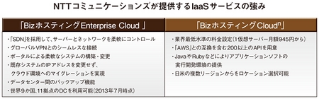 NTT ComのIaaSは、グローバル企業向けの「BizホスティングEnterprise Cloud」と、月額945円(1仮想サーバー)からという低価格な「BizホスティングCloudn」の2種類がある。前者は、SDN(Software Defined Network)を活用して、ICT資源を柔軟に提供するもの。オンプレミス型の基幹システムを、クラウド環境に容易に移行できるようにするなど、「高性能のサーバーやストレージを使った高い信頼性と柔軟性」(田中部長)が特徴だ。