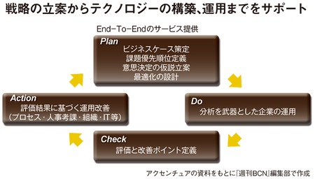 テクノロジーを駆使したビジネス支援などを展開するアクセンチュアが、日本企業のビッグデータ活用支援を積極的に推進している。単なる分析ツールの提供ではないし、ビッグデータ活用のコンサルティングでもない。ビッグデータ活用のチームメンバーが、その戦略立案からテクノロジーの構築、さらにデータを最適化し、ビジネスの収益を最大化させる運用までを提供する体制で挑む。