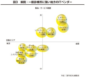 もう一つのカテゴリが、地方の独立系SIer。先に説明したように、病院や一般診療所は全国にムラなく存在する。ITベンダーにとっては、地方にまとまったユーザーが存在する数少ない業種といえるので、自然発生的に病院・一般診療所を専門にするITベンダーが誕生した。鹿児島県のソフトマックス、北海道のシーエスアイ、山形県のエヌデー・ソフトウェア、岩手県のワイズマンはその代表。とくにワイズマンとエヌデー・ソフトウェアは医療機関向けのパッケージを開発して全国展開に結びつけ、株式上場を果たした。大手のITベンダーがワイズマンのパッケージを担ぐケースもみられるほど、異色の存在になっている。