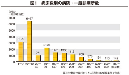 2012年時点で、日本には病院と一般診療所が合計10万8717ある(厚生労働省)。これは学校と比較すると2倍弱の数値だ。病院と診療所の違いは病床数で、医療法では「ベッドがないまたは19床以下」が診療所で、「20床以上を病院」と定めている。ここ数年の増減傾向は、病院が減少して診療所が増加。ボリュームゾーンは病床数10~19床の診療所で、全体の35.6%を占める。