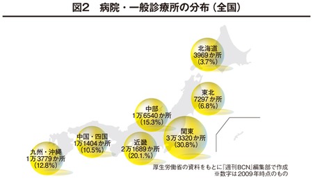 一般企業と異なり、病院と診療所は全国にまんべんなく存在する。企業の場合、東京や大阪、名古屋に集中するが、病院や一般診療所の場合は、学校と同じように県立、市立といった公立が存在するので、地方にも広がっている。