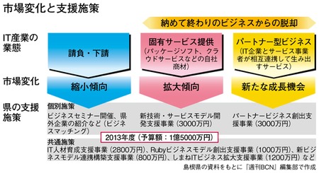 そこで、「納めて終わりの請け負い・下請けビジネスから脱却し、各企業がパッケージやクラウドなどの固有のサービスの提供や、ユーザー企業との密接な結びつきによる“パートナー型ビジネス”に積極的になってもらうことを訴求している」(杉原企画員)という。県は、IT産業振興に1億5000万円の予算を設けているが、このうちの6000万円を、ビジネスモデルの転換に積極的な企業に対する支援にあてている。
