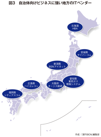 自治体は全国に広がっているので、これらの大手ITベンダーに割って入るかたちで、自治体から元請けでシステムを受注する地方の独立系SIerも存在する。例えば北海道札幌市に本社を置くHBA。北海道庁のIT化を担う企業として1964年に生まれた経緯もあって、自治体向け事業の割合が創業期から高い。同庁のシステム開発・運用ほか、道内の市町村向けITサービス事業も手がけ、道内の自治体向けITベンダーとしては群を抜く存在。年商は、道内に本社を置く独立系ITベンダーのなかで、唯一、100億円を超える。こうしたITベンダーが47都道府県に必ずといっていいほど存在する。
