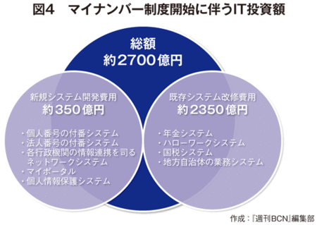 政府は、「マイナンバー制度」開始に伴う関連システムの整備費用について試算し、新規システム開発費用で約350億円、既存システムの改修費用で約2350億円、総額2700億円と見積もった。内訳は、新規システムでは、個人・法人番号の付番システムで160億円、国や地方自治体間でデータの受け渡しを行うネットワークシステム、国民がマイナンバーの情報や行政サービスにアクセスする際のインターフェース、特定の個人情報保護委員会の監視監督システム構築に合計190億円。合わせて350億円が費用になるとみている。一方、既存システムの改修では、年金やハローワーク、国税システムほか、地方自治体の業務システムの変更で約2350億円としている。自治体のこれまでのIT投資額を考えると、膨大な費用であることは明らかだ。