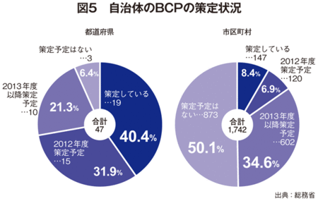 現実的なIT投資分野をみると、未整備なものの取り組む意欲が高い分野が、業務継続計画(BCP)だ。BCPをすでに策定している自治体は、都道府県では40.4%、市町村では8.4%と低い。ただ、取り組む意欲は高く、2012年4月時点で策定予定の自治体は都道府県で53.2%、市町村で41.5%にもおよぶ。東日本大震災後に、BCPを策定するユーザー企業は増えたが、自治体も同様で、BCPに取り組む機運が高まったわけだ。BCPを実行するためには、システムの冗長化やデータのバックアップ、クラウドシステムなど、さまざまなIT投資が必要。これらのITソリューションの需要は、直近でビジネスチャンスがある分野といえるだろう。