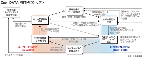 政府全体のオープンデータ利活用推進のための組織としては、有識者と関係府省庁の担当者で構成する「電子行政オープンデータ実務者会議」があるが、経産省は、この「Open DATA METI」の取り組みをベースに、ここでの議論をリードしている。具体的には、「共通語彙・文字基盤の整備」「統合的なデータポータルサイトの構築」などをすでに提案しており、政府の新IT戦略に反映している。(本多和幸)