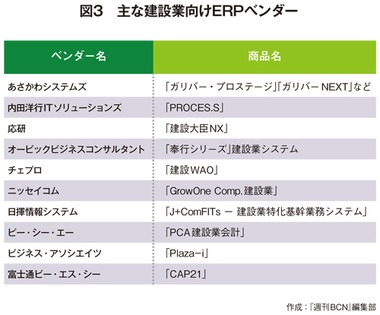 また、建設業にニーズがありそうなのがERPだ。建設業者は「基幹系の情報システムを手組みで開発したり、未整備だったりする企業が多く、他産業よりも10年は遅れている」(建設業向けパッケージソフトベンダー)という。IT投資の削減には、ERPパッケージを活用した基幹システムの刷新が効果的で、ERPは今後も求められそうだ。