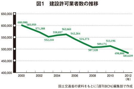 国内建設事業者の数はどれくらいか。国土交通省が調べた2012年3月末時点での建設業許可業者数は、前年同時期に比べて3%減の48万3639業者。最も多かった2000年3月と比べると、11万7341も減った。減少率は19.5%。この10年余りで5分の1が減った勘定になる(図1)。