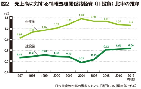 建設業者をみるうえで見逃せないポイントがある。それが「労働生産性」の低さだ。日本生産性本部(旧社会経済生産性本部)は、各業種別で「労働生産性」を調査し、公表している。全産業の労働生産性を1とした場合、建設業は過去20年、1990年を除いて、1に達していない。つまり、他産業に比べて仕事にムダがあるなど、生産性が低いというわけだ。日本生産性本部はこの理由について、ITの利用が遅れていることを挙げている。建設業のIT投資は、全産業の平均額に比べて半分以下だという(図2)。
