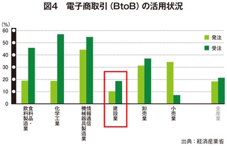 ITの利用が遅れている建設業で、一般的なITインフラが整っていない現状を説明したが、電子商取引(BtoB)も進んでいない(図4)。ここにITベンダーのチャンスがあるだろう。