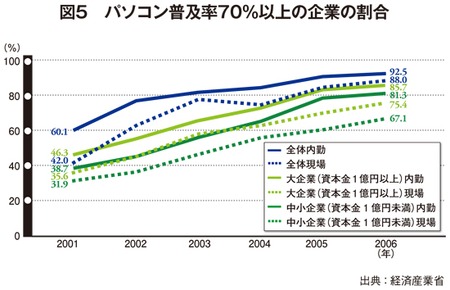 例えば06年の時点でLANやイントラネットを構築済みの企業は81.7%、社内ネットワークがインターネットに接続されている企業は76.0%、Eメールを利用している企業は54.0%にとどまっており、全産業の平均値よりも下回っている。どれも、仕事をこなすうえで必要なITインフラだけに、これらの数値は極めて低いとみることができる。国土交通省や建設業関連の団体は、IT化を促進するために、利用方法などを示したガイドラインなどを整備しているが、いまだ建設業のIT化は他産業よりも遅れている実態がある。