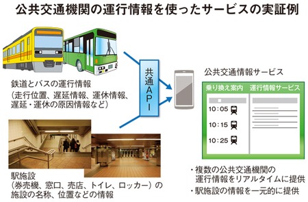 「情報流通連携基盤共通API」は、データモデル、データ表現形式、共通ボキャブラリから成る「標準データ規格」と、「標準API規格」で構成される。総務省は、この実証実験を平成24年度(2012年度)に開始しており、例えば公共交通情報を活用した実証実験で、複数の鉄道やバスの運行情報を共通APIで横串を通して活用し、さまざまな公共交通機関のリアルタイムな位置情報を一つの地図上で閲覧できるサービスや、実際の遅延情報を考慮した最適なルート案内サービスなどが実現できることを検証している。