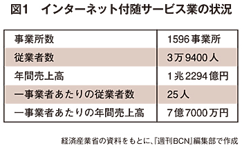 インターネットサービス業は新興産業だけに、さまざまな定義があるが、公的機関のなかでは経済産業省の「特定サービス産業実態調査」で分類されている「インターネット付随サービス業」が最も近いジャンルだ。この調査でのインターネット付随サービス業の定義は、「ネットを活用した情報提供やサーバーなどのIT機器の機能をユーザーに提供する事業」。具体的にいえば、ウェブサイトの運営やアプリケーションソフト・コンテンツをネットを通じて提供する企業や、ネットを利用する際のサポートを提供するサービス事業者などを指している。