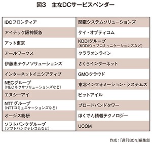 大手のDCベンダーは、1か所のDCだけでなく、万が一、システムを運用しているDCにトラブルが発生した際に別の地域のDCに切り替えて運用できるように複数のDCをもつケースが多い。サーバーメーカー同様に、DCベンダーはインターネットサービス事業者をターゲットにした営業活動に積極的で、このマーケットではDCベンダーの存在が欠かせない。