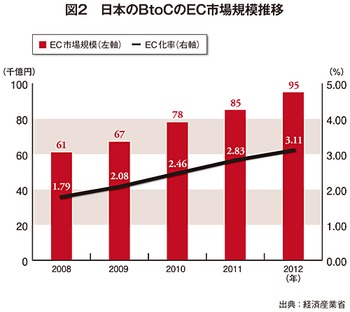 インターネット付随サービス産業の現状を図1に示した。約1600事業者が存在し、4万人ほどの従業員がいて、産業規模は約1兆円(2010年)。日本の名目GDP(国内総生産額)が約482兆円(2010年)であることからすれば、規模は小さい。だが、ほぼ毎年、前年実績を超えている成長産業である。とくに、BtoCのEC(電子商取引)ビジネスは伸び盛りで、経済産業省によれば、2012年の個人向け製品・サービスのECの前年比伸び率は12.5%増。EC化率も徐々に高まっている。過去5年、ほぼ同じ割合で伸びている(図2)。