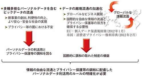 経済産業省(経産省)のある幹部は、「民間企業でのパーソナルデータの利活用について、標準化や指針類の作成、審査・認証・助言機関の設置などの方向性を打ち出したことは、新IT戦略の目玉の一つ」と言い切る。ビッグデータ利活用の環境整備のポイントとなるパーソナルデータ利活用のルール明確化と規制緩和は、日本の産業活性化という観点でみたときに、それほど大きなインパクトをもつということだ。