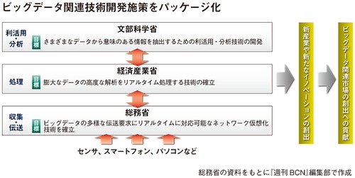 ビッグデータ関連施策では、短期的に取り組むべきテーマとして「基礎技術の開発」が掲げられている。担当省庁は、総務省、文部科学省、経済産業省の3省だ。実はこの3省は、新IT戦略が確定する前から、平成25年度事業として予算を確保し、この事業を開始している。