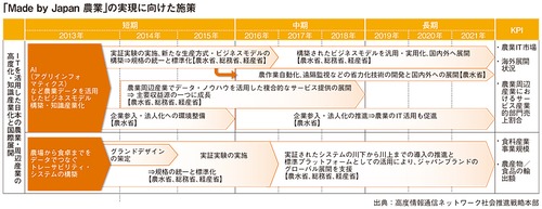 具体的には、篤農家の高度なノウハウをデータ化して、小規模農家も含む多数の経営体で共有・利活用するスキーム「AI(アグリインフォマティクス)農業」を2016年までに確立する。さらに、農場から食卓までをデータでつなぐトレーサビリティ・システムの確立にも取り組み、多種多様な事業者から成る農作物のバリューチェーンを構築。2017年以降、これらの技術を使って生産・流通させる農産物や、技術そのものを安全・安心な「ジャパンブランド」として海外へ本格的に売り出す。