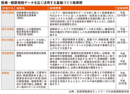 一方、データ活用の基盤づくりのための施策群は、今年度スタートする新規の施策が多く、予算もさらに大規模になっている。予算規模が最も大きいのは厚労省で、医療報酬の明細書であるレセプト情報や健診情報を活用した健康増進支援施策に、2013年度補正予算案と2014年度予算案を合わせて60億円以上を計上している。