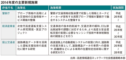 2014年度にスタートする注目施策をみると、まずは警察庁が、警察の交通情報収集装置の情報と、民間のプローブ交通情報を融合するシステム整備に乗り出す。プローブ交通情報とは、実際に自動車が走行した位置、スピードなどの情報から生成される道路交通情報をいう。ベースとなる各種データは、カーナビシステムなどを通じて収集される。警察の交通情報収集装置のセンサは道路に設置されているので、センサが設置されている主要道路の情報しか取得できない。この弱点を補うために、カーナビメーカーなどがもつプローブ情報と融合することで、災害時の道路交通機能確保に役立つ、高度な交通情報サービス環境を整備しようとしているのだ。