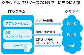 クラウドはITリソースの種類によって主に三つに分類される。それが「SaaS」「PaaS」「IaaS」だ。ポイントだけ押さえておこう。