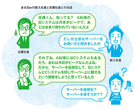 サーバーは、システムの処理がピーク時でも問題なく稼働することが求められる。ところが、ピークは決まった時期に訪れることが多く、そこを過ぎるとサーバーは遊んでいる状態になる。ピークにあわせて高性能なサーバーを保有しているとしたら、なんとももったいない話だ。そこで出番となるのが「仮想化」である。企業は一般的に複数のシステムを活用しているが、処理のピークが同じ時期とは限らない。であれば、1台のサーバー上に、ピークの時期が違うシステムを載せることで、有効活用できることになる。このように、1台のサーバー上に、あたかも複数のサーバーがあるような環境を実現するのが、仮想化である。