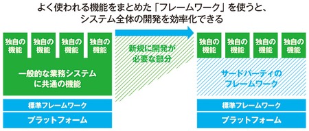 フレームワークは、共通する機能を提供することにより、プラットフォーム上での開発作業の効率化を実現する。例えば、基本的な画面のボタンや入力項目などが、代表的な共通機能である。基本的なフレームワークは、プラットフォームとセットになって開発キット(SDK)の一部として用意されている。図では「標準フレームワーク」とした。加えて、業務システムのような特定分野に向けて、開発企業が社内で独自に作成したり、コミュニティの手でつくられたりするフレームワークも多い。図では「サードパーティのフレームワーク」とした。