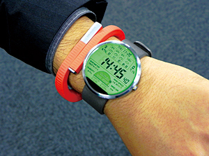 幅朝徳・CRIWAREエヴァンジェリストが身につけているウェアラブル端末の一例 しかし、その一方で、ウェアラブル端末を普及させるうえでの課題も浮き彫りになった。ウェアラブル関連に詳しいCRI・ミドルウェアの幅朝徳・CRIWAREエヴァンジェリストは、「ウェアラブル端末が普及するための一番のポイントは“楽しさ”だ」と分析している。スマートフォン連動機能やライフログのようなヘルスケア機能といった実用性もさることながら、「一般ユーザーが数万円の端末を購入する動機づけは、エンターテインメント的な楽しさやファッション性がなければ、まず難しい」と指摘する。