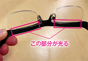 「雰囲気メガネ」の実物 LEDライトの強さはフレーム上部外側の照度センサによって自動的に制御され、暗いところでは光を抑え、直射日光下では明るく発光する。LEDライトは間接照明の原理を応用し、目に直接光が入らない設計にした。また、「ピッ」と耳元で小さく鳴る電子音も備えていることから「光と音を組み合わせて、スマートフォンからどんな種類の通知があったのかがわかる」(雰囲気メガネプロジェクトに参加している三城ホールディングスの河村和典・チーフエバンジェリスト)と話す。