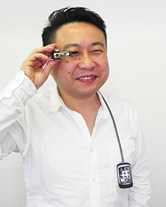 「Telepathy Jumper」を首に掛ける鈴木健一代表取締役 具体的な用途としては、例えば風光明媚な観光地で、おもむろにTelepathy Jumperを取り出し、首に掛ける。内蔵のカメラで美しい景色を撮影し、リアルタイムに遠隔地にいる友人や家族と映像を共有することも容易だ。周囲の雰囲気に合わせて、取り出したり、鞄にしまったりすることで、前述の“社会的な抵抗感”を最小限にとどめている。かつ、従来の手持ちのカメラと異なり、手に持たなくて済むのはもちろん、眼鏡型ウェアラブルの最大の特徴である“ユーザーの視線を共有”できる。