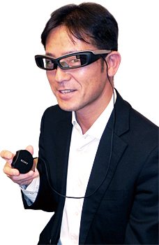 ホログラム導光板を実装した「SmartEyeglass(スマートアイグラス)」をかける武川洋・統括部長 ただ、ソニーが目指している「普通のメガネと変わらない使い勝手」にまで完成度を高めるには、より一段の小型軽量化が欠かせない。実機では、かなりおおざっぱにメガネをかけても映像や文字がくっきり見えるところまできている。目の位置は人によってバラツキが大きく、「鼻メガネ」のように前方にかけるのを好む人もいるなど、「かなりアバウトにかけても映像が見える」(武川統括部長)ように設計した。 (つづく)(安藤章司)