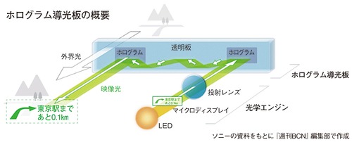 メガネ用の透明なレンズに透過型の映像を映し出すには、ハーフミラー(マジックミラー)やプリズム機構を用いる方法が知られているが、これでは、透過率が高まらなかったり、映像が不鮮明だったり、あるいはプリズム機構の厚みがでてしまうなどの不都合があった。ソニーでは「ホログラム導光板」と呼ばれる独自の方式を10年がかりで開発し、学会発表も行ったが、肝心の量産技術でつまずいてしまった。ホログラム導光板は、メガネのレンズ部にホログラム光学素子を組み込むことで、映像を伝搬する仕組み(図参照)。この方式を使えばレンズを厚さ1ミリまで薄くできるとともに、透過率を85%超まで高められるという。